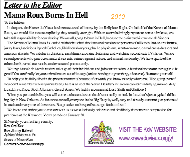 2010 Mama Roux Theme: As a response to the Religious Wrong picketing our parade, we costumed as sinners to spoof their vision of our fate in “Mama Roux Burns In Hell”.