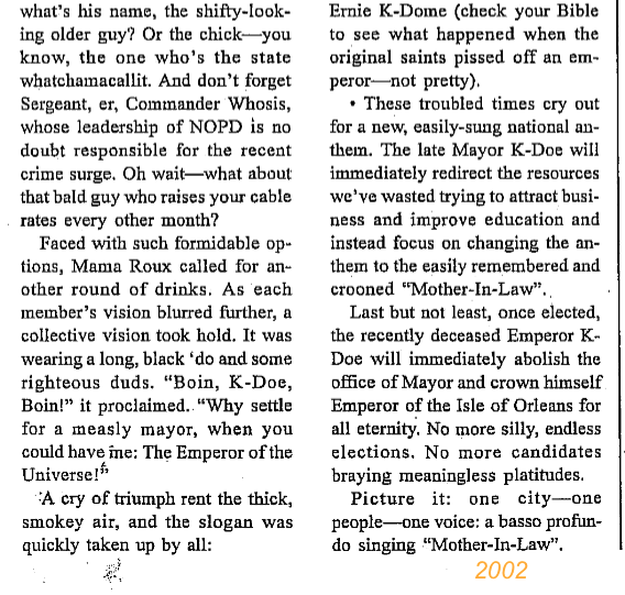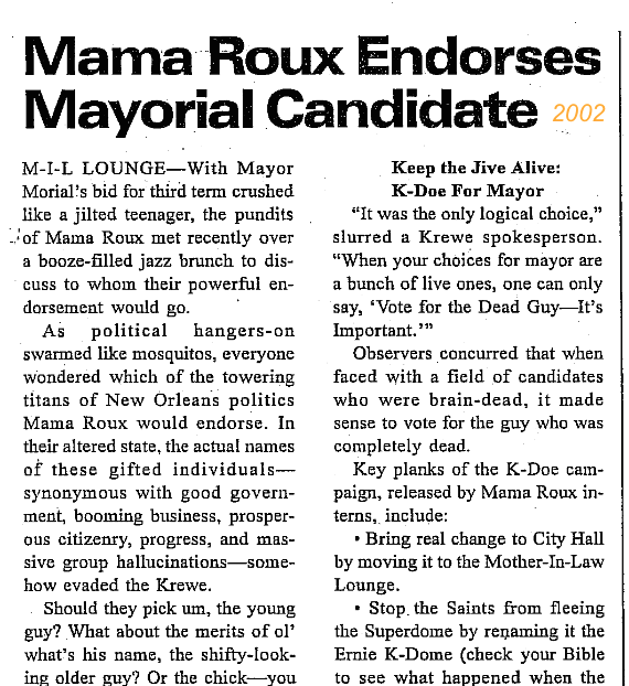 2002 Mama Roux Theme: members went as Ernie K-Doe in “Keep the Jive Alive: K-Doe for Mayor”.
