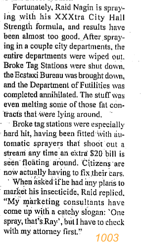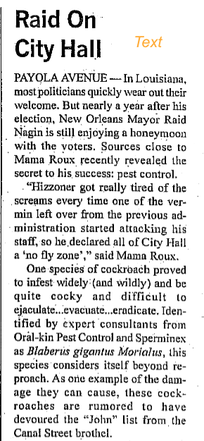 2003 Mama Roux Theme: brown cockroaches for “Raid Nagin”.